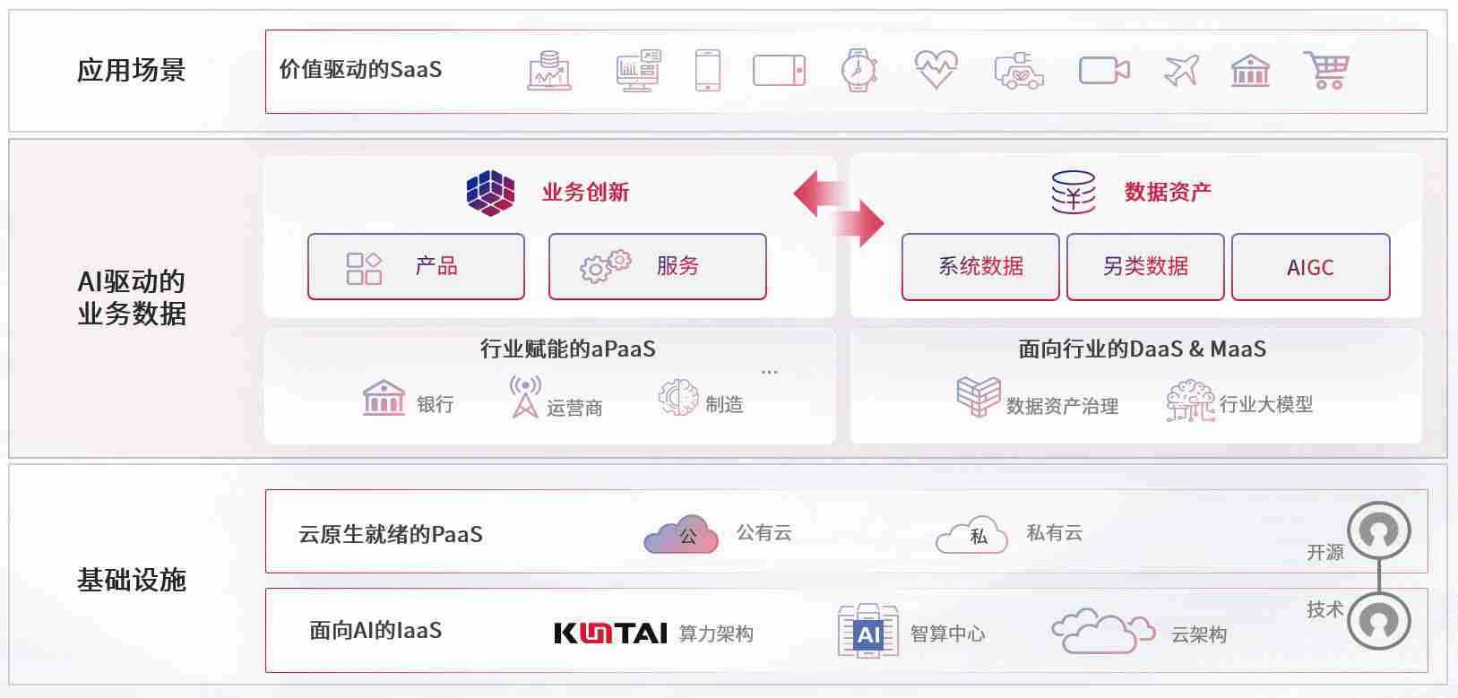 在基础设施层面,,,基于商业或开源的云原生就绪开发工具与技术组件(PaaS)和面向AI的底层公共基础设施资源(IaaS),,将共同支撑企业完成数字化转型